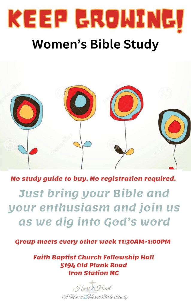The “KEEP GROWING” study series will continue when we gather again on Wednesday, August 9th. If you are in the Charlotte Mecklenburg/Lincoln County/Gaston County area, we would love to have you come grow with us.