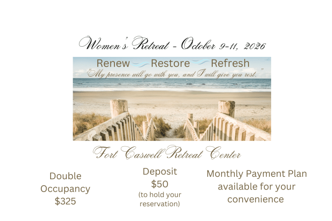Make your plans now to join us October 9th through 11th, 2026, as once again we will gather at Fort Caswell Conference center for a weekend to Renew, Restore and Refresh. We want to make it easy for you to plan ahead, just a $50 deposit will hold your spot. Rooms are limited and filling up fast.